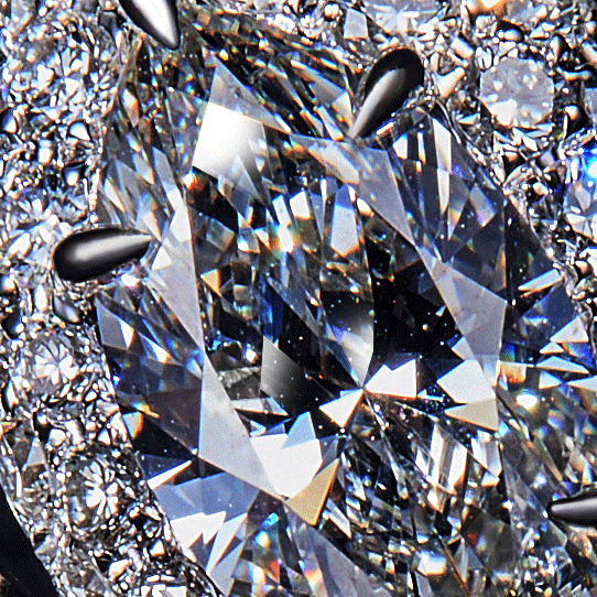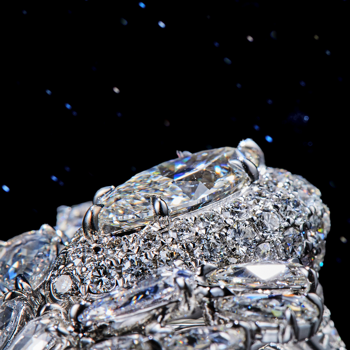 10顆玫瑰車工梨型鑽與120顆圓鑽交織鑲嵌。