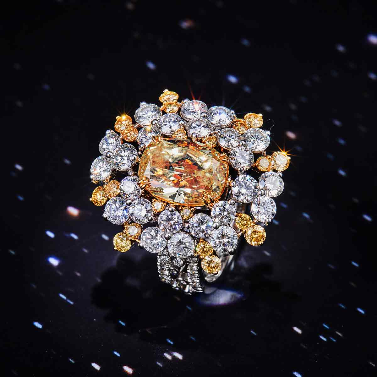 3.73克拉黄彩鑽,象微黎明破曉時的重生與希望,由78顆圓鑽與20顆黄鑽層層環繞,曙光灑落,映照出細膩而著華的光芒。